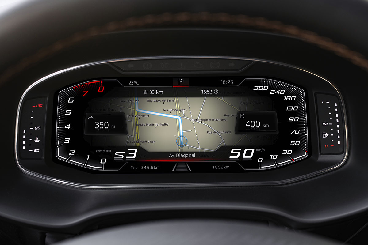 On profite de l’occasion pour vous parler un peu du design intérieur. Et l’on se dit que, décidément, le tandem Seat/Cupra a définitivement laissé derrière lui l’étiquette du «parent pauvre» du groupe Volkswagen. Fini les technologies reprises, plusieurs mois après, des autres marques du groupe: désormais les cousines espagnoles sont à la pointe du progrès. Le tableau de bord est digital et peut se paramétrer à l’envi, le volant sport asymétrique est petit et regroupe un minimum de commandes essentielles, l’écran géant du combiné GPS/audio/réglages est parfait et doté d’une fonction d’«éveil» qui le fait entrer en mode actif dès que vous approchez la main, et la console centrale regroupe le reste des commandes.